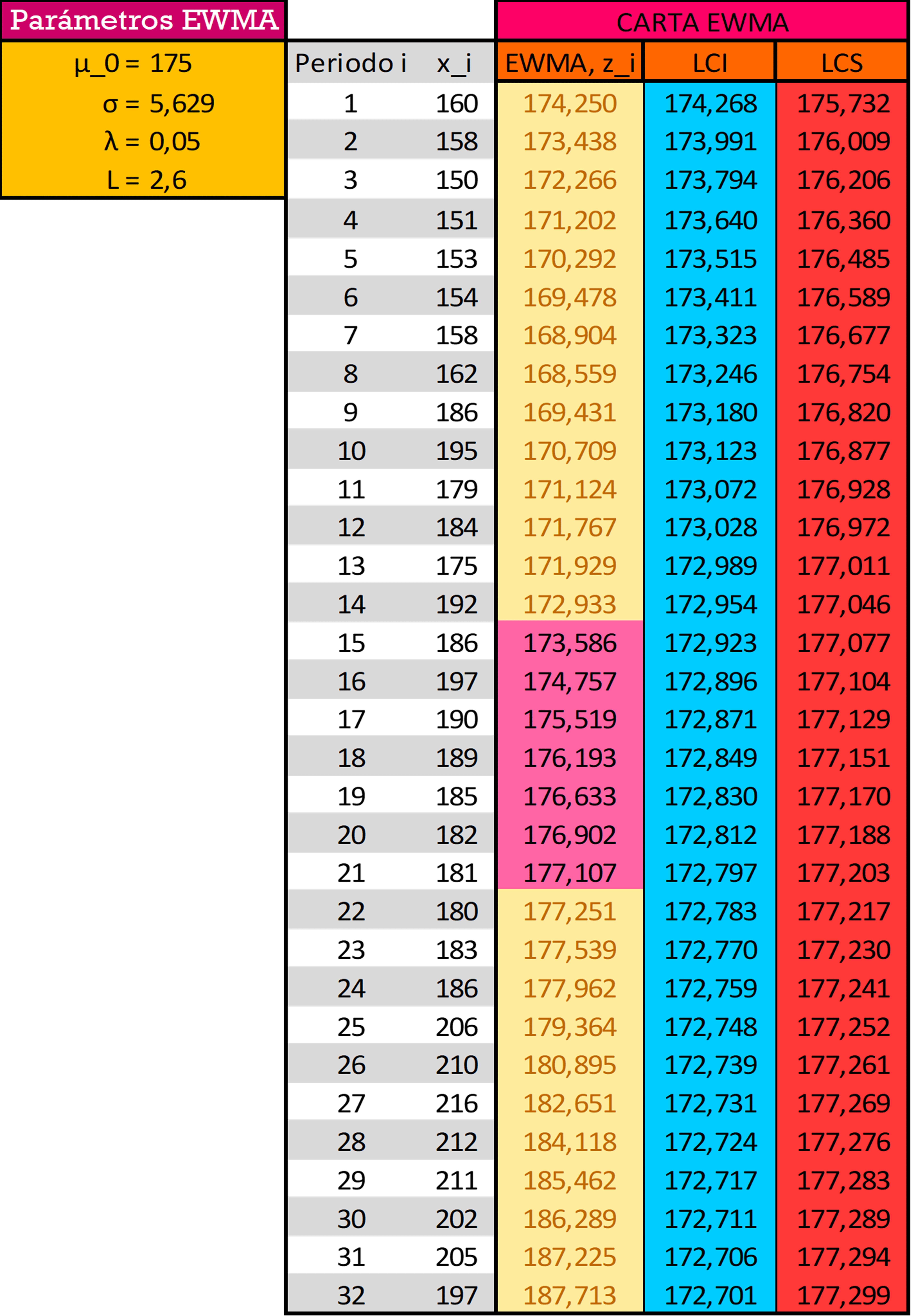 Antes que nada, cabe resaltar que hay un error de digitación en la muestra\(\#9\) (el valor de \(x_4\) no es \(64.1\) sino \(84.1\)). Dicho cambio se realiza ya que para el apartado siguiente (y no podemos eliminar dicho punto ya que no contamos con una causa asignable para él). Sabemos que dicho cambio se debe hacer para que cuadre el valor de \(\overline{x}\) de la muestra \(\#9\), escrito en la tabla.