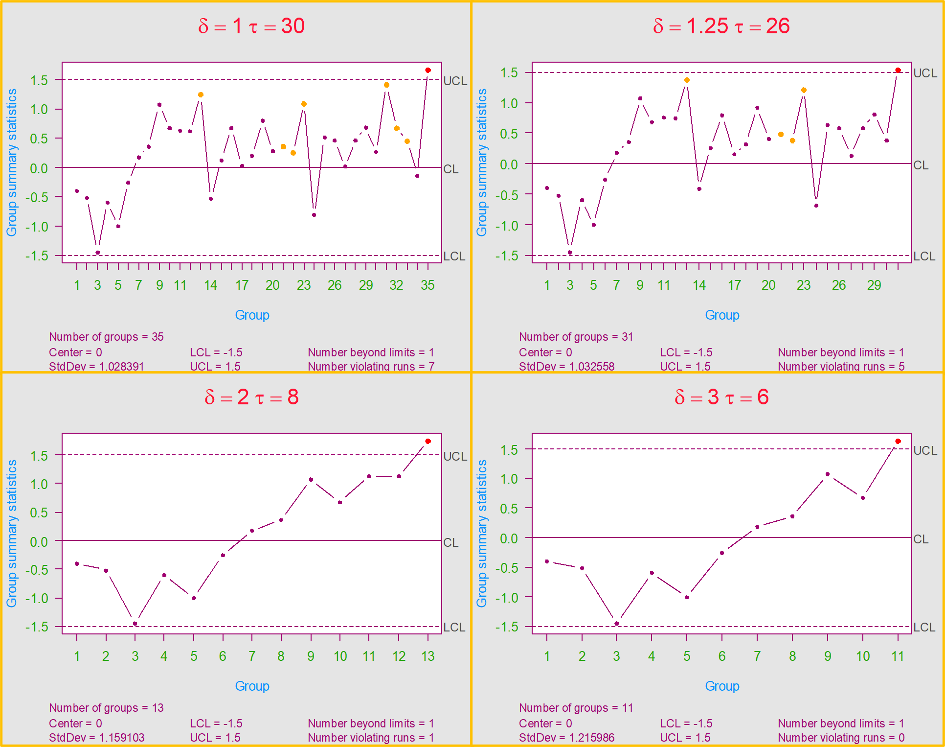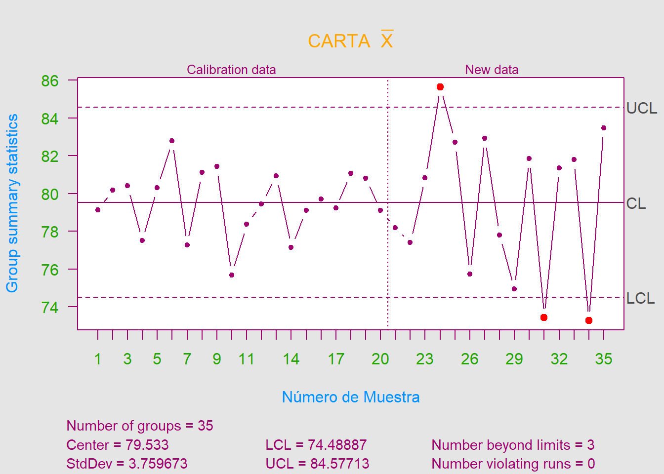 set.seed(963852)NumSample <-10; TamSample <-4mu0 <-0; sigma <-1; A <-3/sqrt(TamSample)Muestras <-matrix(data =rnorm(NumSample*TamSample, mu0, sigma), nrow = NumSample, ncol = TamSample)delta <-3.0# Luego con 1.25,2.0,2.5 y 3.0mu1 <- mu0 + delta*(sigma/sqrt(TamSample))CartaXbar <-qcc( Muestras, type ="xbar", center = mu0,limits =c(mu0-A*sigma,mu0+A*sigma), plot =FALSE)Prueba <-sum(CartaXbar$violations$beyond.limits)while (Prueba==0) { x <-rnorm(n = TamSample, mean = mu1, sd =1) Muestras <-rbind(Muestras, x)rownames(Muestras) <-1:nrow(Muestras) CartaXbar <-qcc( Muestras, type ="xbar", center = mu0,limits =c(mu0-A*sigma,mu0+A*sigma), plot =FALSE ) Prueba <-sum(CartaXbar$violations$beyond.limits)}New_CartaXbar <-qcc( Muestras, type ="xbar", center = mu0,limits =c(mu0-A*sigma,mu0+A*sigma), plot =FALSE)T <- New_CartaXbar$violations$beyond.limitsEstimador <-NULLfor (i in0:(T-1)) {if (i==T-1) { xbarbar <-mean(Muestras[1:(T-i), ]) }else { xbarbar <-mean(rowMeans(Muestras[1:(T-i), ])) } Estimador[i] <- (T-i)*((xbarbar-mu0)^2)}Estimador_tau <-c(1:(T-1))[Estimador==max(Estimador)]c("Delta"= delta, "Estimador_tau"= Estimador_tau)