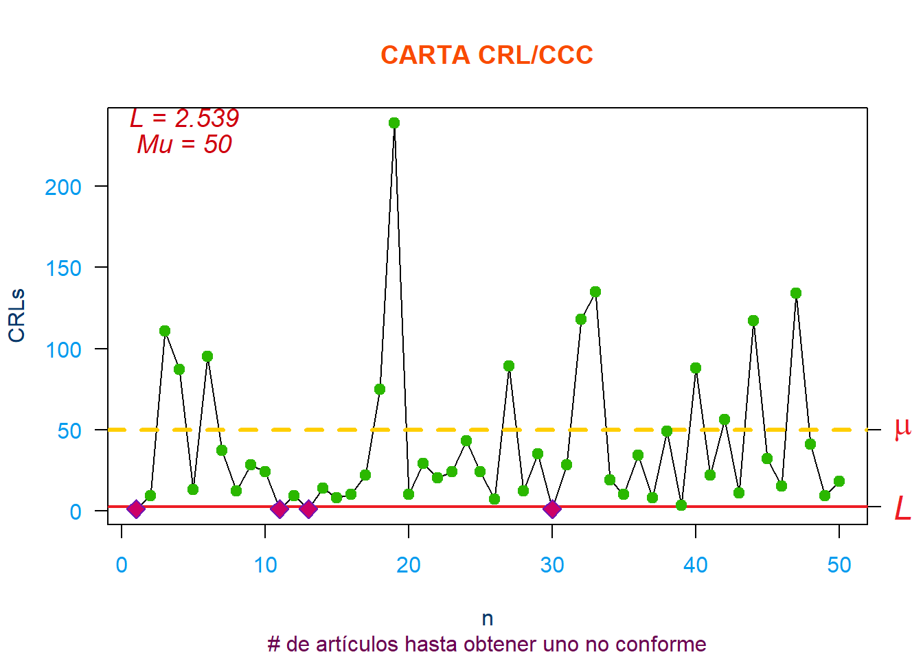 ARL_T2Hotelling <-NULL ;ARL_MCUSUM <-NULL; ARL_MEWMA <-NULLfor (i in1:10000) { mu0 <-matrix(c(0,0,0), ncol =1) Sigma <-diag(3) Muestras <-rmvnorm(n =20, mean = mu0, sigma = Sigma)# PARÁMETROS CARTA T2 HOTELLING Alpha =0.001# PARÁMETROS CARTA MCUSUM (valores de k y h que dan ARL0 = 200) K =0.5; h =30.5# PARÁMETROS CARTA MEWMA (valores de Lambda y H que dan ARL0 = 200) Lambda =0.5; p =3# delta <- sqrt( t(mu)%*%solve(Sigma)%*%mu ) H <-round(mewma.crit(l = Lambda, L0 =200, p = p), 3)# CARTAS Carta_T2Hotelling <-mqcs.t2(Muestras, Xmv = mu0, S = Sigma, alpha = Alpha, phase =2, plot = F) Carta_MCUSUM <-mqcs.mcusum(Muestras, Xmv = mu0, S = Sigma, k = K, h = h, phase =2, plot = F) Carta_MEWMA <-mqcs.mewma(Muestras, limits =c(0,H), Xmv = mu0, S = Sigma, phase =2, plot = F)# CAMBIO DE mu0 delta <-0.0# Luego para 0.5, 1, 1.5, 2, 2.5 y 3 mu1 <- mu0 + delta Muestras_T2Hotelling = Muestras; Muestras_MCUSUM = Muestras; Muestras_MEWMA = Muestras# ========================== CARTA T2 DE HOTELLING =========================== # Prueba_T2Hotelling <-sum(Carta_T2Hotelling$violations)while (Prueba_T2Hotelling==0) { x <-rmvnorm(n =1, mean = mu1, sigma = Sigma) Muestras_T2Hotelling <-rbind(Muestras_T2Hotelling, x)rownames(Muestras_T2Hotelling) <-1:nrow(Muestras_T2Hotelling) Carta_T2Hotelling <-mqcs.t2(Muestras_T2Hotelling, Xmv = mu0, S = Sigma, alpha = Alpha, phase =2, plot = F) Prueba_T2Hotelling <-sum(Carta_T2Hotelling$violations) } ARL_T2Hotelling[i] <-nrow(Muestras_T2Hotelling)# =============================== CARTA MCUSUM =============================== # Prueba_MCUSUM <-sum(Carta_MCUSUM$violations)while (Prueba_MCUSUM==0) { x <-rmvnorm(n =1, mean = mu1, sigma = Sigma) Muestras_MCUSUM <-rbind(Muestras_MCUSUM, x)rownames(Muestras_MCUSUM) <-1:nrow(Muestras_MCUSUM) Carta_MCUSUM <-mqcs.mcusum(Muestras_MCUSUM, Xmv = mu0, S = Sigma, k = K, h = h, phase =2, plot = F) (Prueba_MCUSUM <-sum(Carta_MCUSUM$violations)) } ARL_MCUSUM[i] <-nrow(Muestras_MCUSUM)# =============================== CARTA MEWMA ================================ # Prueba_MEWMA <-sum(Carta_MEWMA$violations)while (Prueba_MEWMA==0) { x <-rmvnorm(n =1, mean = mu1, sigma = Sigma) Muestras_MEWMA <-rbind(Muestras_MEWMA, x)rownames(Muestras_MEWMA) <-1:nrow(Muestras_MEWMA) Carta_MEWMA <-mqcs.mewma(Muestras_MEWMA, limits =c(0,H), Xmv = mu0, S = Sigma, phase =2, plot = F) Prueba_MEWMA <-sum(Carta_MEWMA$violations) } ARL_MEWMA[i] <-nrow(Muestras_MEWMA)}( ARL1_T2Hotelling <-mean(ARL_T2Hotelling) )( ARL1_MCUSUM <-mean(ARL_MCUSUM) )( ARL1_MEWMA <-mean(ARL_MEWMA) )