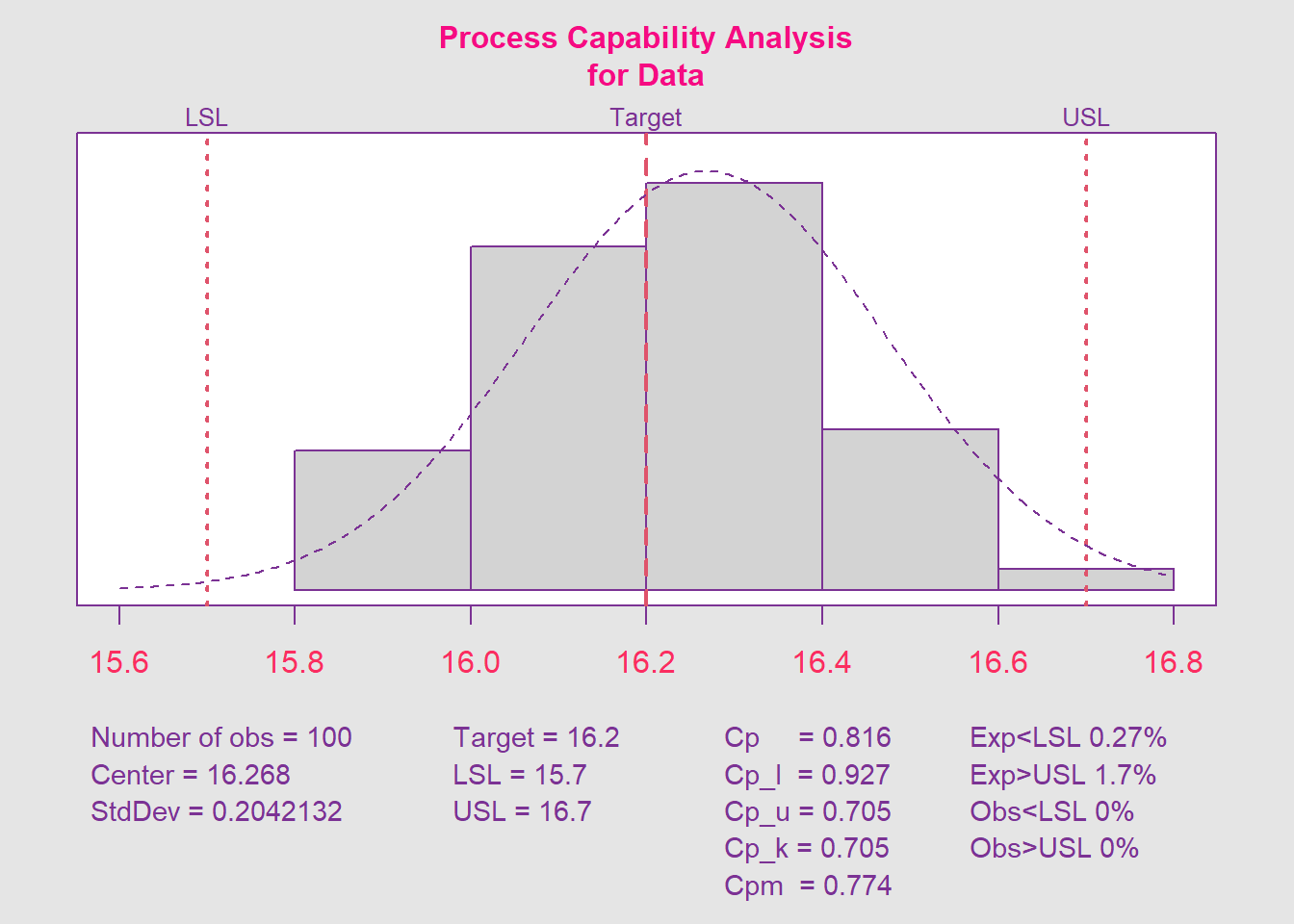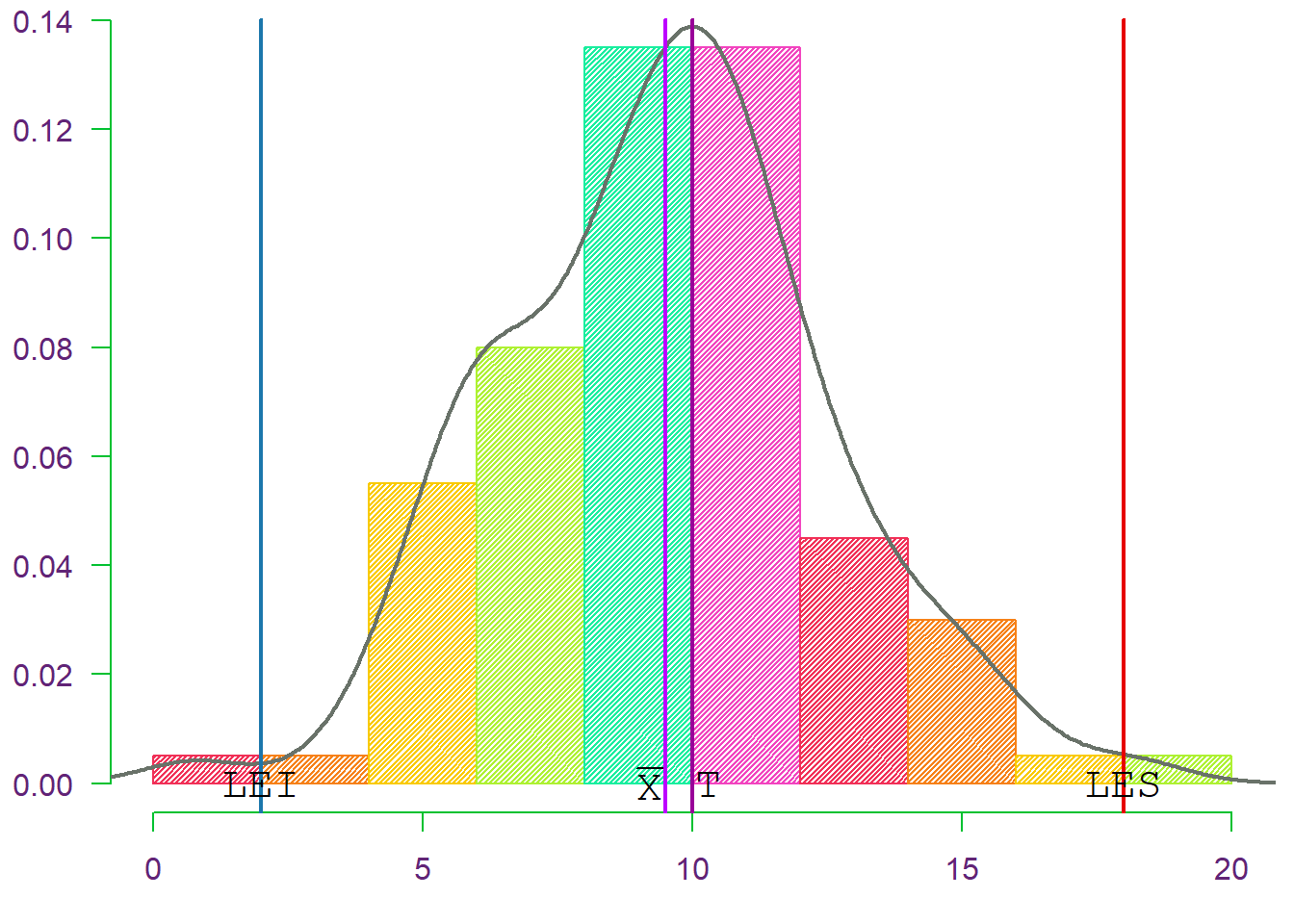 De acuerdo con lo anterior (Figure 2), \(\approx 3\) de cada \(1000\) envases producidos por el proceso está por debajo del límite inferior de especificación.