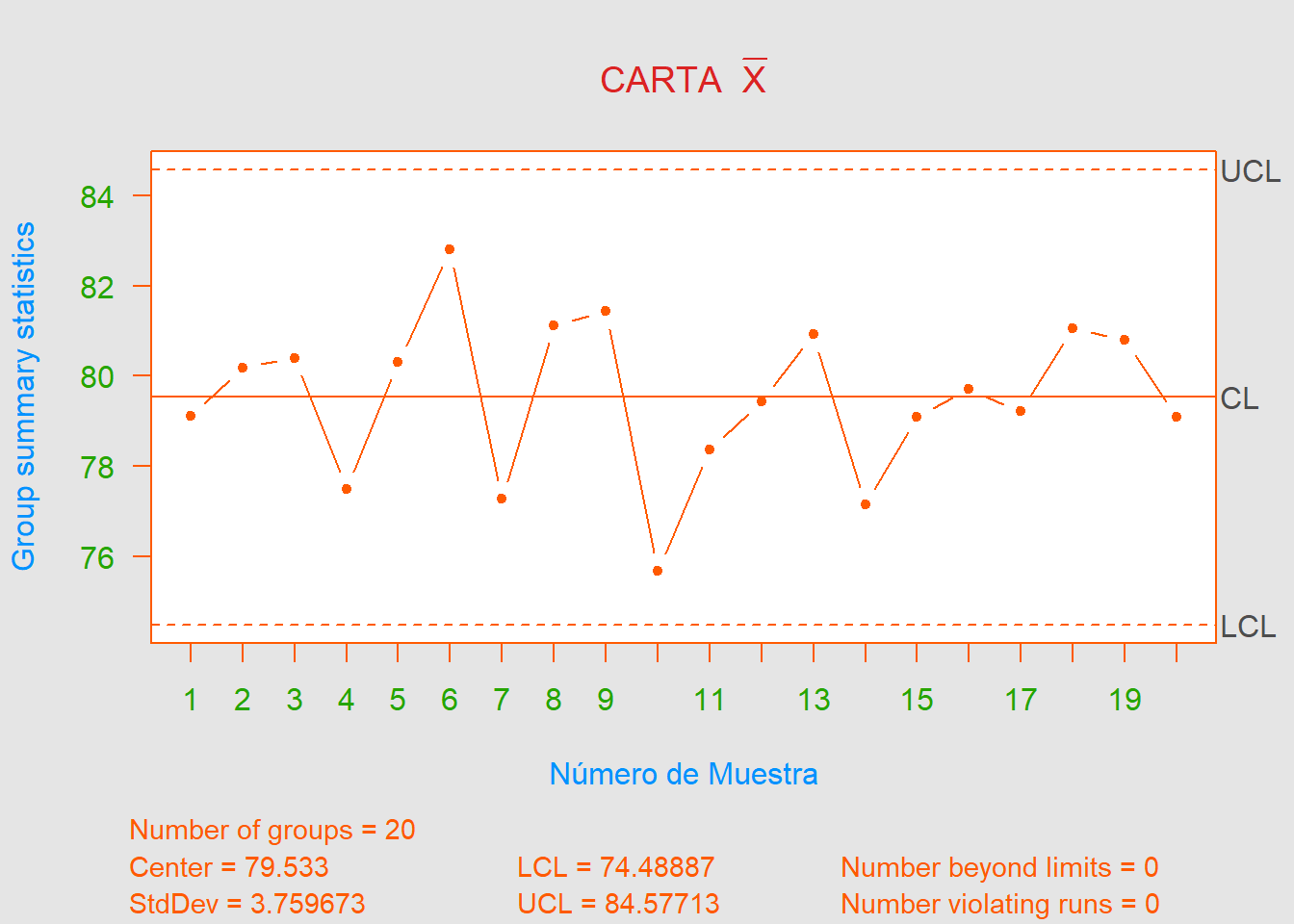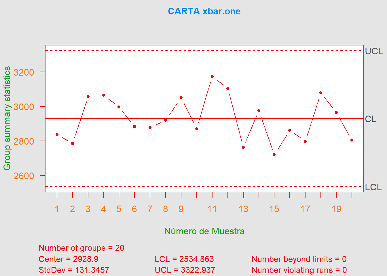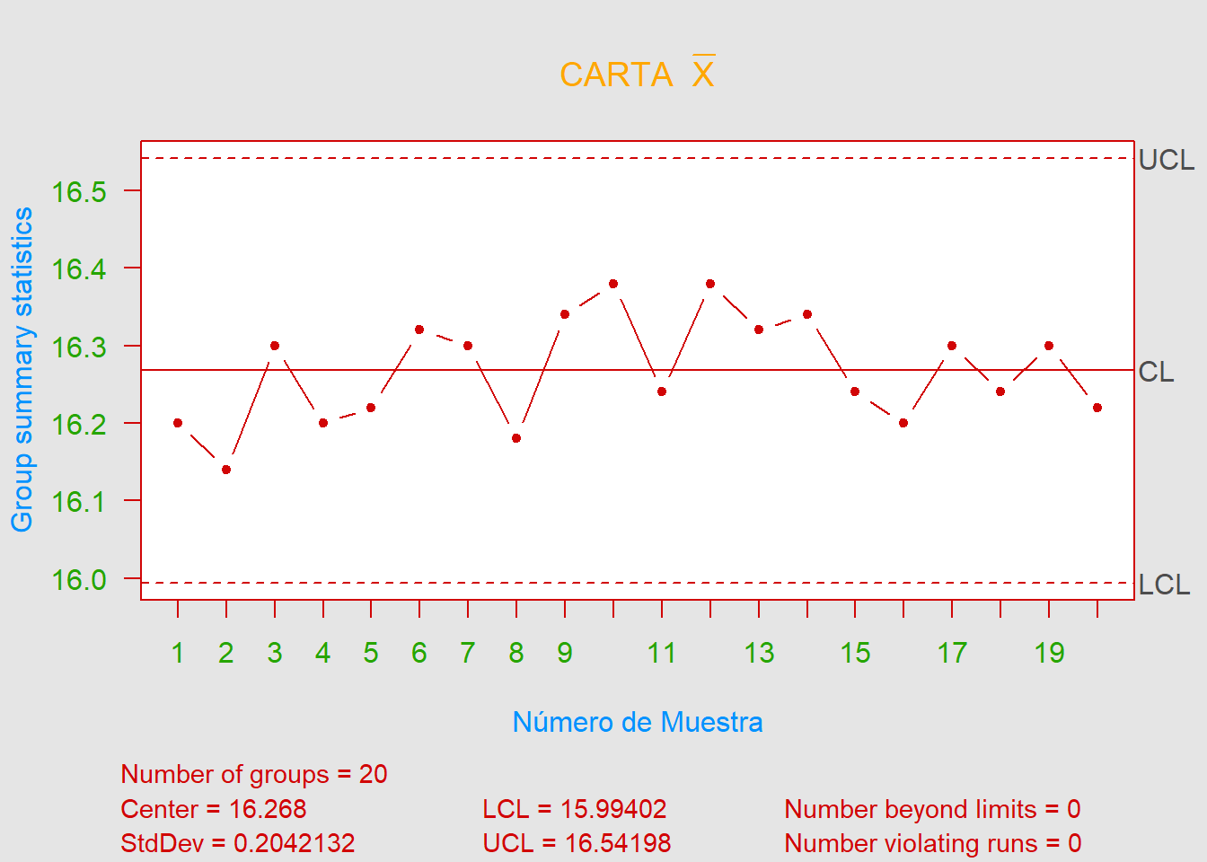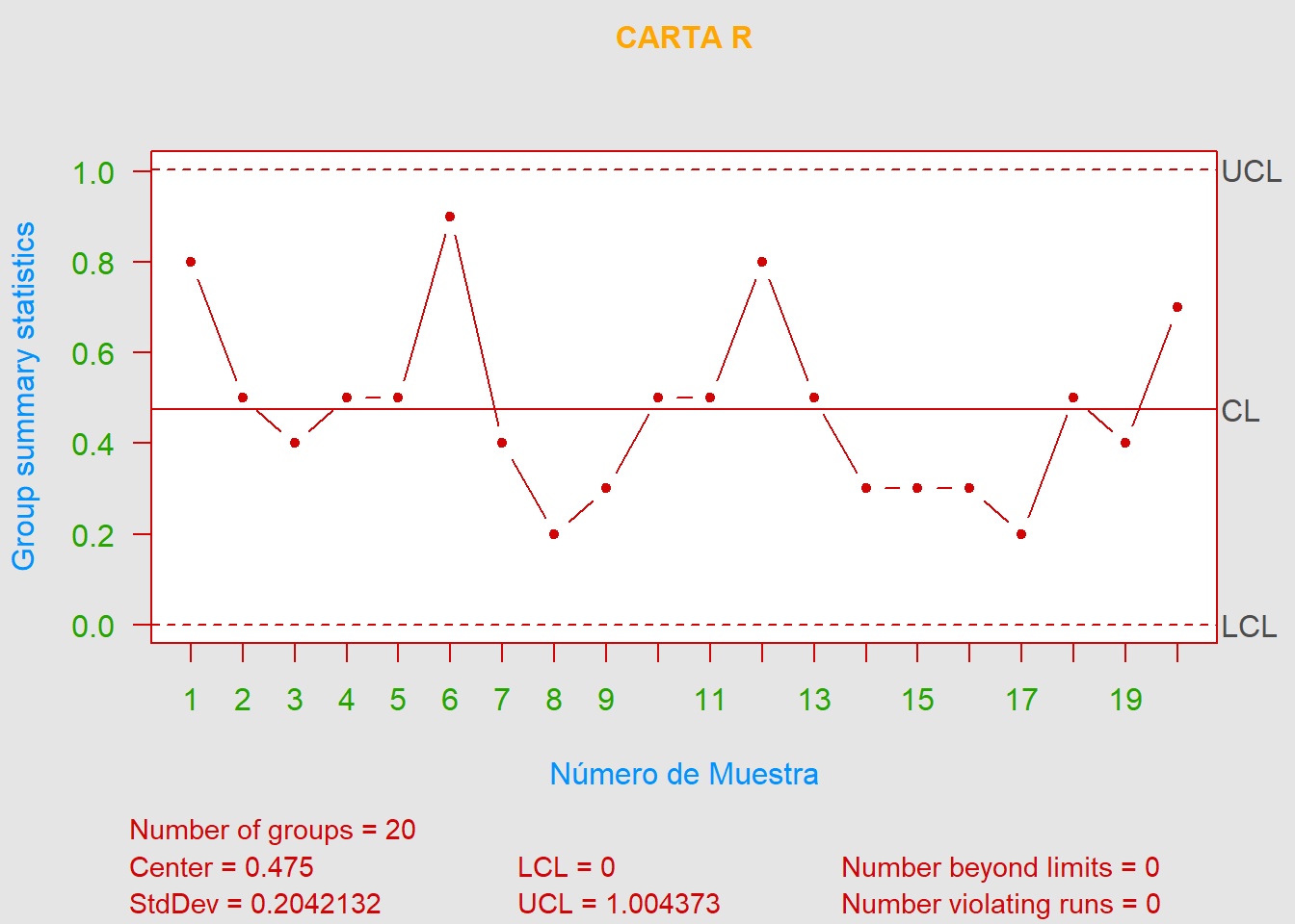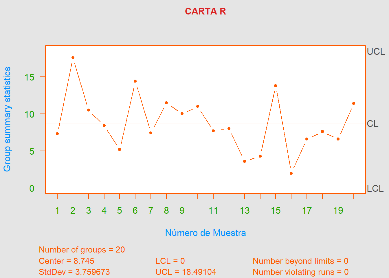 De acuerdo con las cartas de control \(R\) y \(\overline{X}\) (Figure 1) podemos afirmar que el proceso está bajo control estadístico.