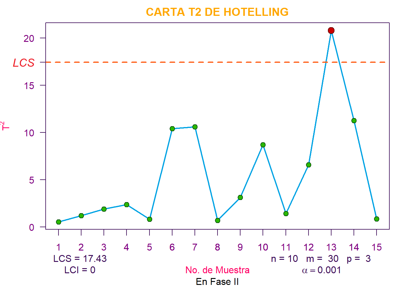 Los límites de control en Fase II, para la carta \(T^2\), con \(m=30\) muestras preliminares, \(n=10\) como tamaño de muestra, \(p=3\) características y con un \(\alpha=0.001\), es,