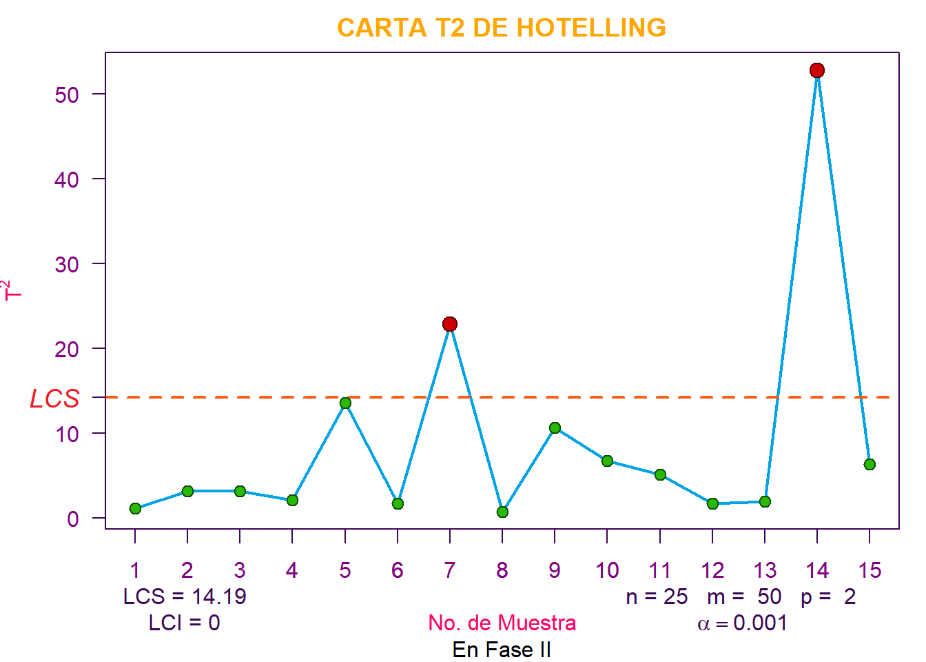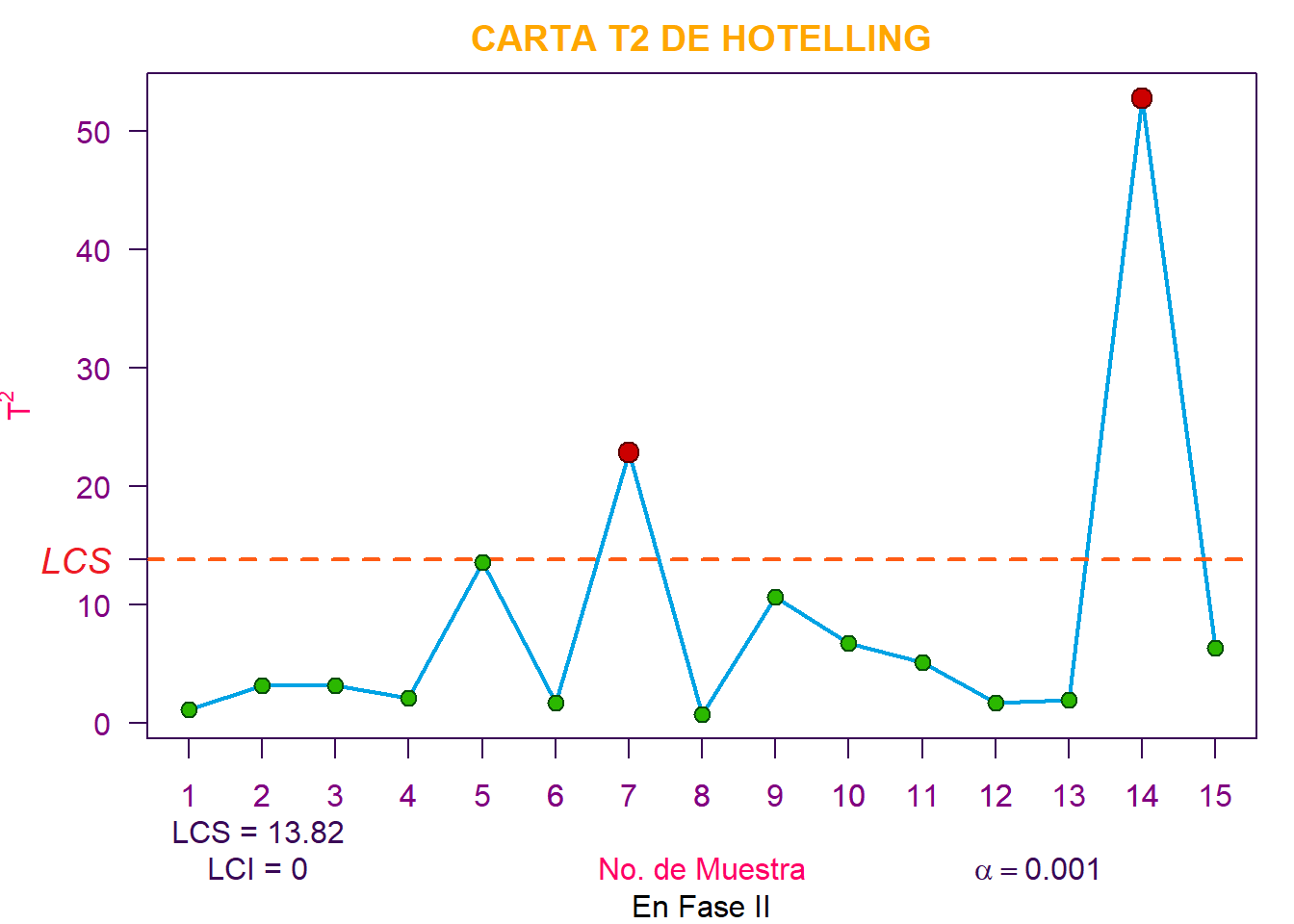 De acuerdo con lo anterior, obtenemos que la estadística \(T^2 = 11.154\). Con lo cual, sí se genera una señal fuera de control, debido a que \(T^2 = 11.154 \;{\color{green} >}\; LCS_{\text{chi-cuadrado}} = 7.8147\).
