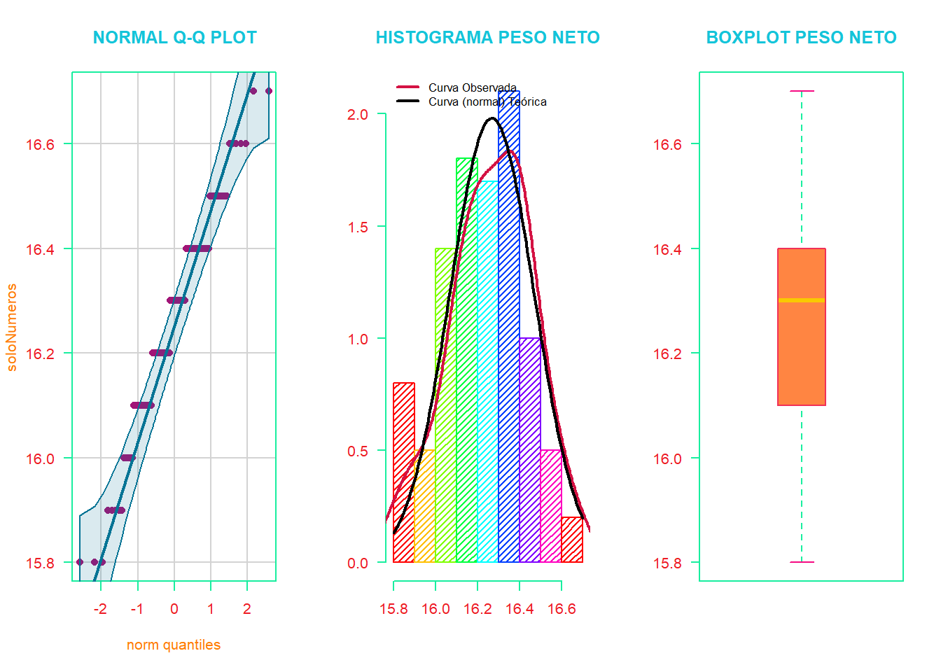 En este caso como el tamaño de muestra no es muy grande (\(n = 100\)) no se recomienda usar la prueba de Kolmogorov-Smirnov, usaremos entonces las que se ajusten mejor a nuestro caso. Tanto el test de Shapiro-Wilk como el de Jarque-Bera nos indican que los datos provienen de una distribución normal, ya que el p-valor\({\color{green} >} \;\alpha\) por lo tanto no se rechaza \(H_0 :=\) Los datos siguen una distribución normal. Finalmente, podemos afirmar que, con un nivel de confianza del \(90\%\), el peso de relleno sigue una distribución normal y gráficamente pareciera ser así.