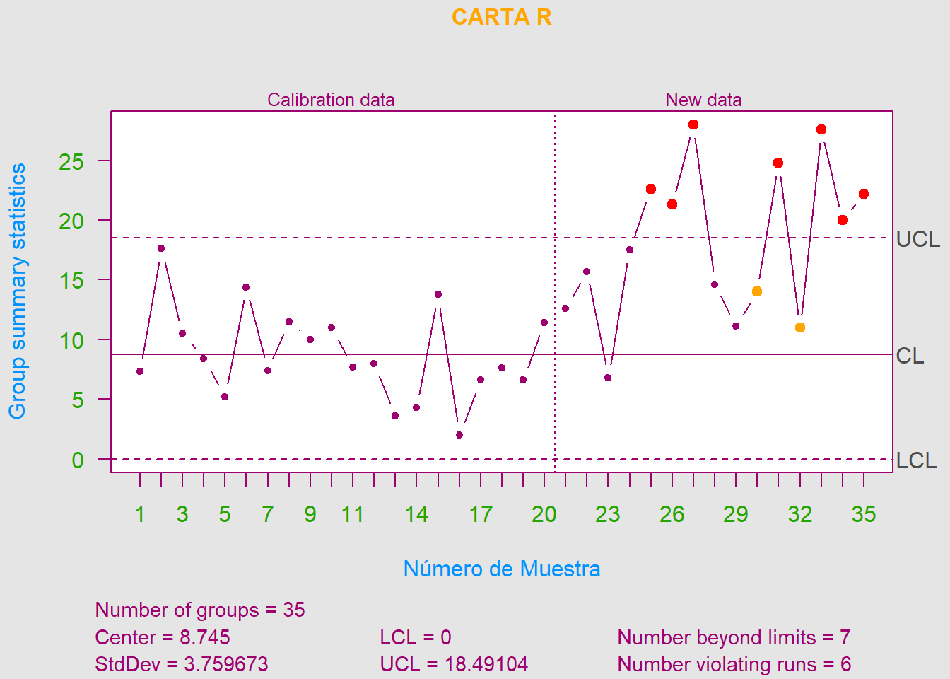 Primero que todo, cabe resaltar que nos encontramos ahora en Fase II (ya que el proceso anterior estaba bajo control). Con esto, podemos observar (Figure 4) que varios subgrupos exceden el límite superior de control en la carta \(R\).